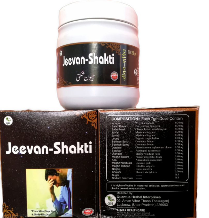 Jeevan Shakti Majun is prepared as per Unani & Aayurvadic guide line by Time trusted ingredients (costly Ingredients like SALAM PANJA SATAVARI SAFED MUSALI BEHMAN SURKH INDERJOAU which boost the Vigour & vitality also provide Aphrodisiac Result specially libido. It will enhance the level of Testosterone (a male hormone) also enhance the immunity & increase inner strength. Also effective in general Debility.